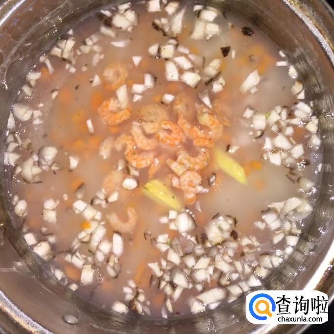 先将胡萝卜和鲜香菇下入锅里,翻搅均匀,煮1-2分钟;再将虾米和姜片下入锅里,翻搅均匀,煮3-4分钟;