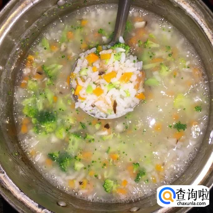 材料:粥米 胡萝卜 西兰花 鲜香菇 虾米 姜 酱油 盐 鸡精