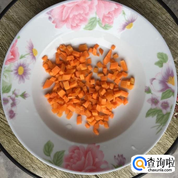 取半根胡萝卜,将胡萝卜去皮,洗净,切成丁状;