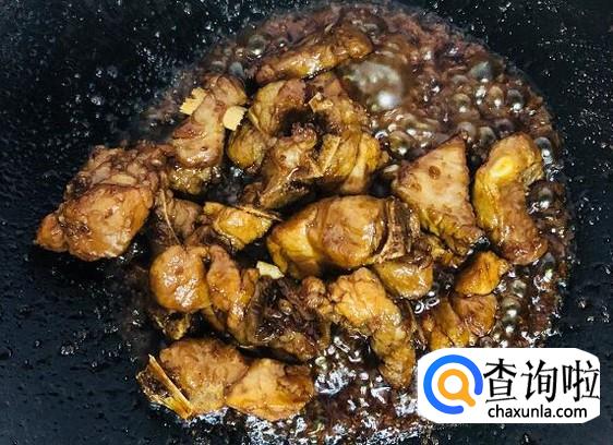 排骨慢慢裹上酱汁,颜色浓郁了。锅中还有少许酱汁的时候用大火翻动排骨,快速收汁使排骨均匀裹上酱汁,锅中有一些焦香就可以了。