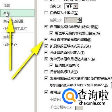 点击“高级”后,右边弹出与之相关的设置选项。我们找到“允许直接在单元格内编辑”,并在其左侧的小方框内点击一下,打上对勾。