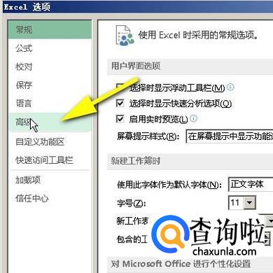 调出了excel选项设置面板。在面板的左侧这里,再点击:高级