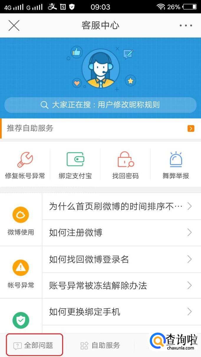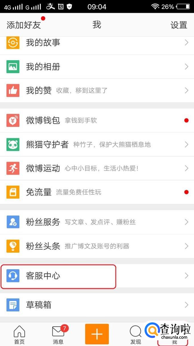 首先,我们打开微博,先去看看客服那看看问题的答案。进入微博首页后,点击“我”,然后下滑屏幕找到“客服中心”。