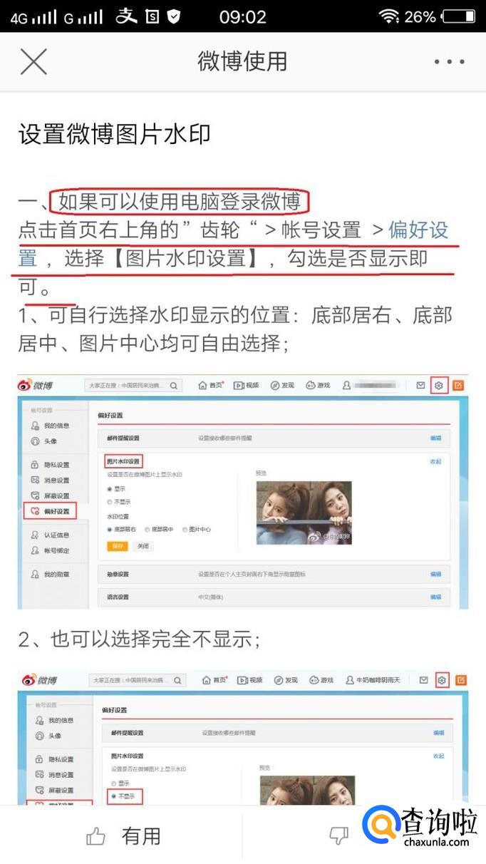 第一种方法,是用电脑登录微博,然后根据图中步骤设置图片水印,这种方法我试过,是可以的。