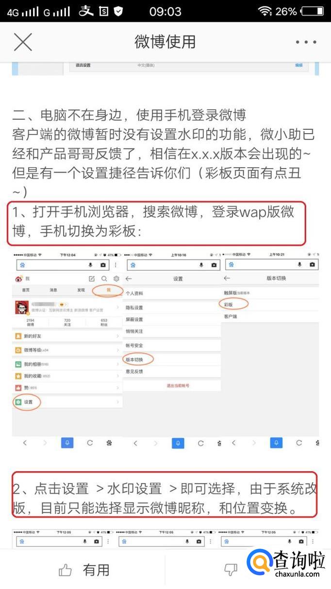 第二种方法,用手机登录网页版微博,切换成彩版,但是我进去试过,里面没有“水印设置”这一项,所以目前这个方法是不可行的。所以目前只能通过电脑登录微博才能设置图片水印。