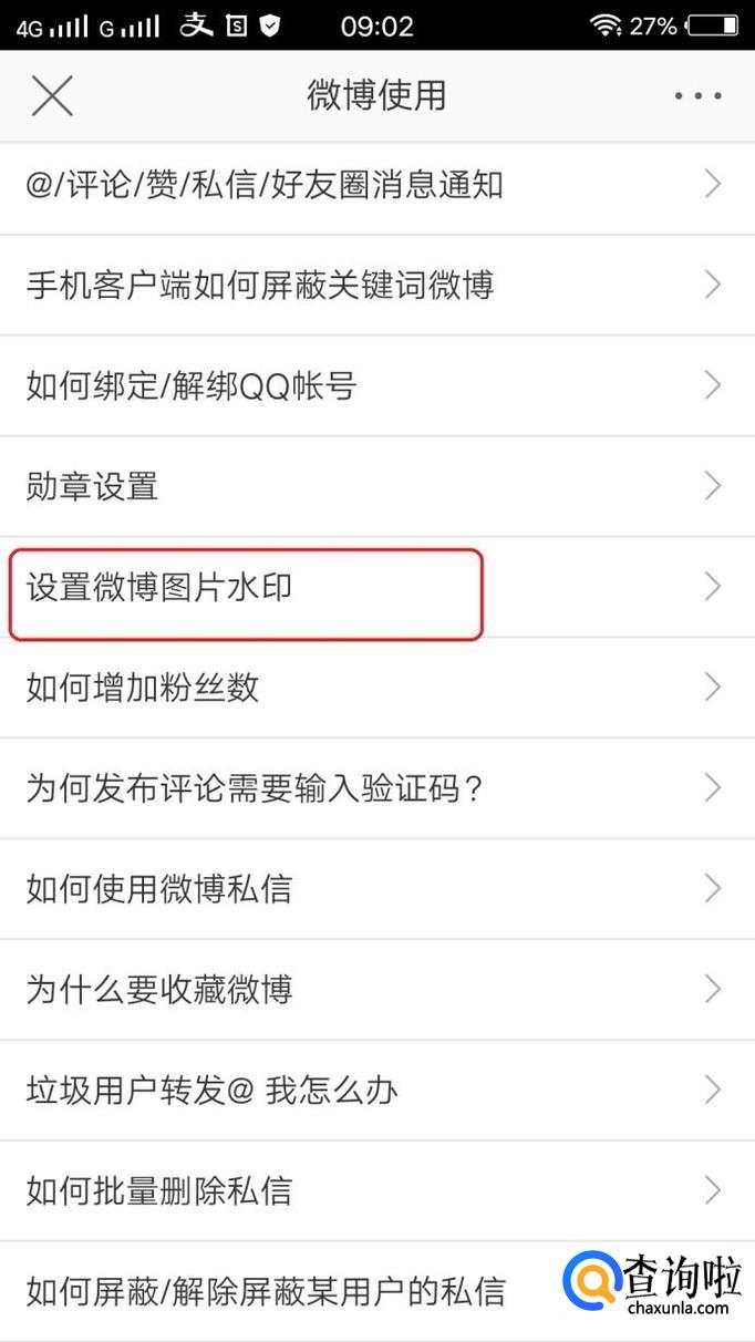 点击左下角“全部问题”,在“微博使用”中,就能找到“如何设置微博图片水印”的问题。我们来看看里面的回答。
