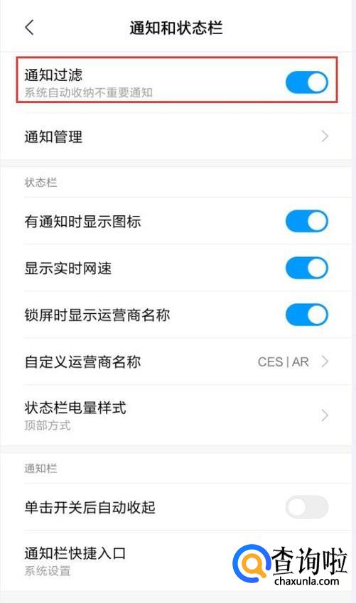 在“通知和状态栏”界面,开启“通知过滤”功能,这样的话就能把大部分不重要的推送收集到同一推送抽屉中,不会受到过多打扰。