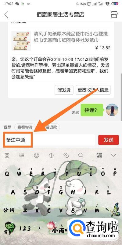 接下来我们点击【对话框】,向对话框中输入你想要的备注,比如小编想要中通快递,就向客服输入的【备注中通】 ,写完之后点击【发送】,客服就会给你备注好