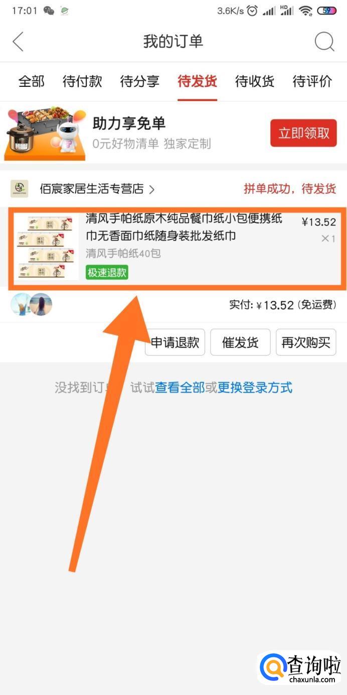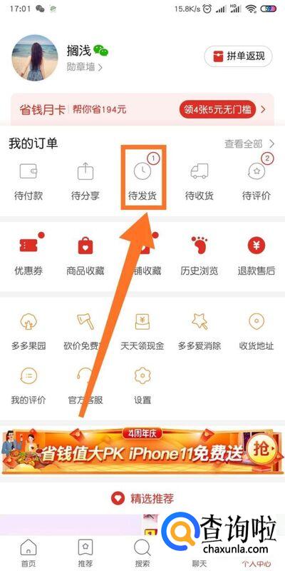 接下来我们点击我的订单中的【待发货】。