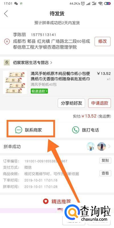 进入订单后,我们点击【联系商家】。