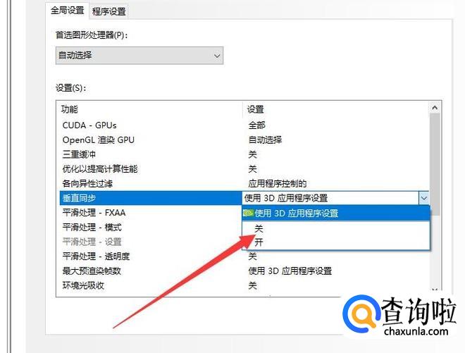 进入之后,在全局设置页面找到“垂直同步”,点击图示位置选择“关”即可将其关闭,如图所示。