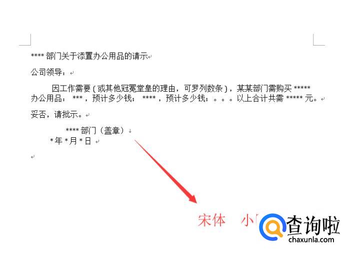 注意所有的请示内容要用宋体,小四号字,间距17左右