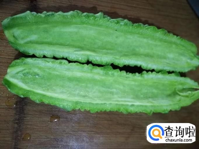将苦瓜对半剖开,去除内瓤后切成片备用。