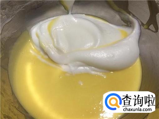 我们将蛋黄打散,并且加入白砂糖、低筋面粉和柠檬汁一起搅拌,然后还要将蛋白打出丰富的泡沫。