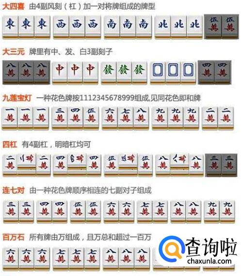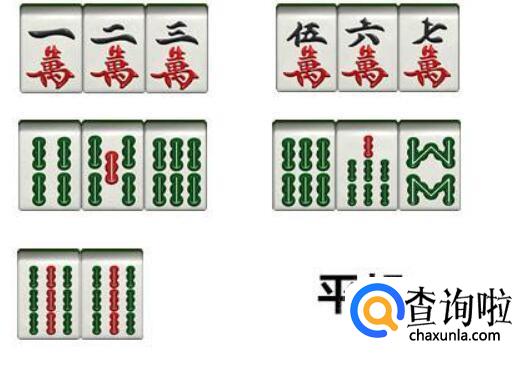 和牌的基本牌型 (1)11、123、123、123、123 (2)11、123、123、123、111(1111,下同) (3)11、123、123、111、111。 (4)11、123、111、111、111. (5)11、111、111、111、111。