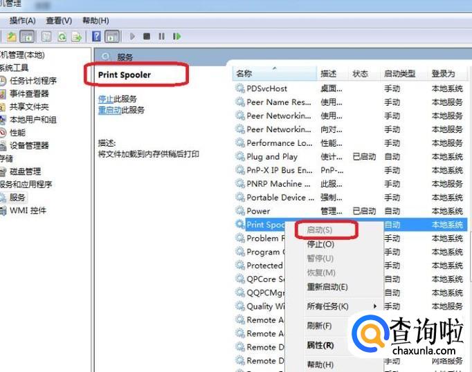 此时,就看到了本计算机的服务列表,我们在其中找到“print spooler”,右键单击选择“启动”。