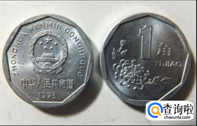 1998年1角硬币,直径22.5毫米,正面图案为国徽,宋体汉字“中华人民共和国”、阿拉伯数字年号。背面图案为菊花图案,并注汉语拼音“YI JIAO”。