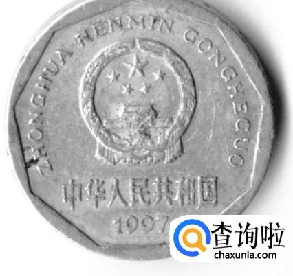 1997年1角硬币,沈阳造币厂铸造,中国人民银行发行,形状为外圆内凹九边形,材质为铝镁合金,重量为2.2克,直径22.5毫米,厚2.4毫米,正面图案为国徽、宋体汉字“中华人民共和国”,汉语拼音“ZHONGHUARENMINGONGHEGUO”,阿拉伯数字年号。背面图案为菊花图案,面值1角,并注汉语拼音“YI JIAO”。