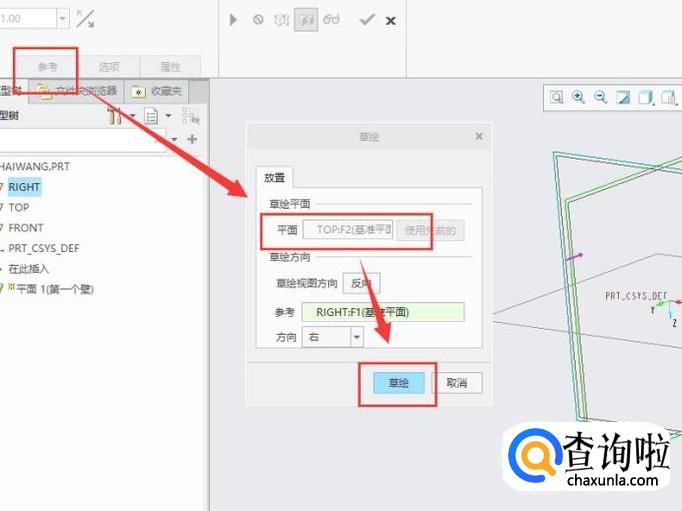 进入之后,点击“参考”,将Top面设置为草绘平面,如图所示。