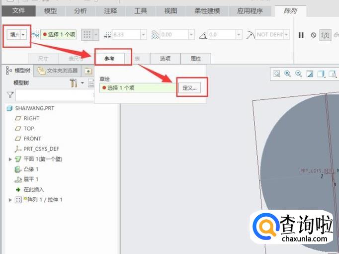 进入之后,选择“填充”,然后对草绘平面进行定义,如图所示。