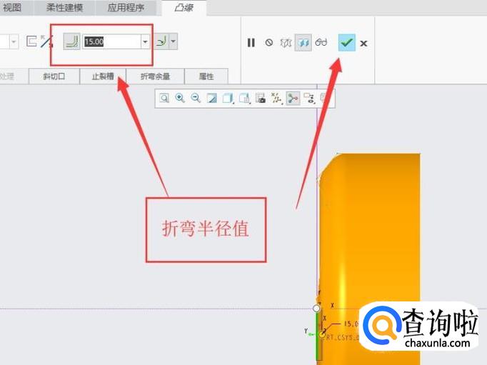 返回到法兰界面,将折弯半径值设置为15,点击绿色对勾即可,如图所示。