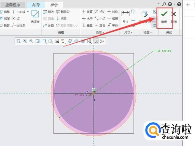 进入草绘平面之后,绘制一个直径为550的圆,然后点击“确定”,如图所示