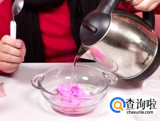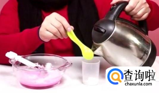 将硼砂用勺子舀到小杯子里,添加一勺至两勺即可,然后添加热水,将硼砂融化成硼砂水。