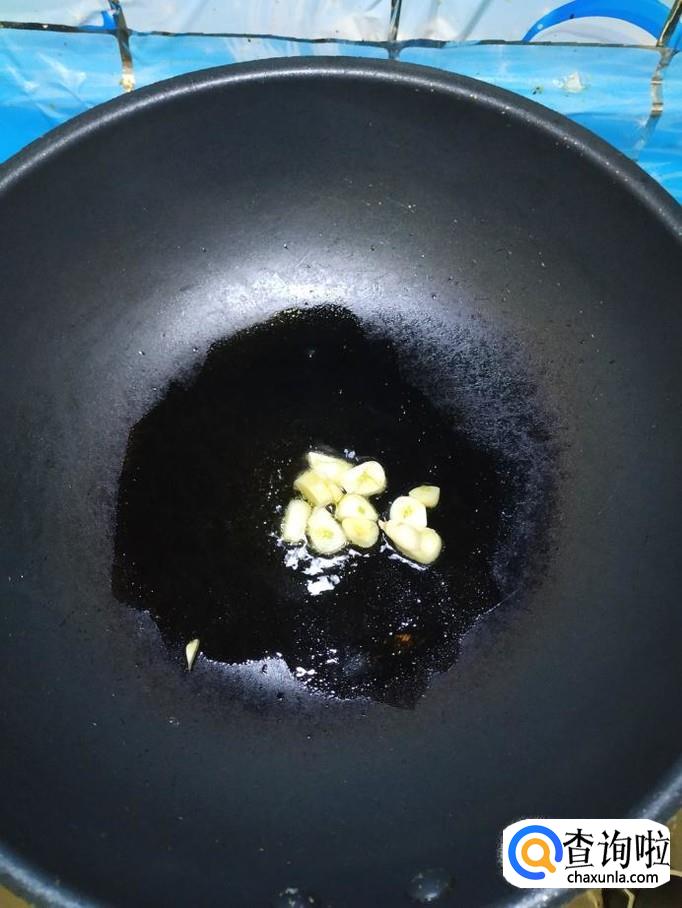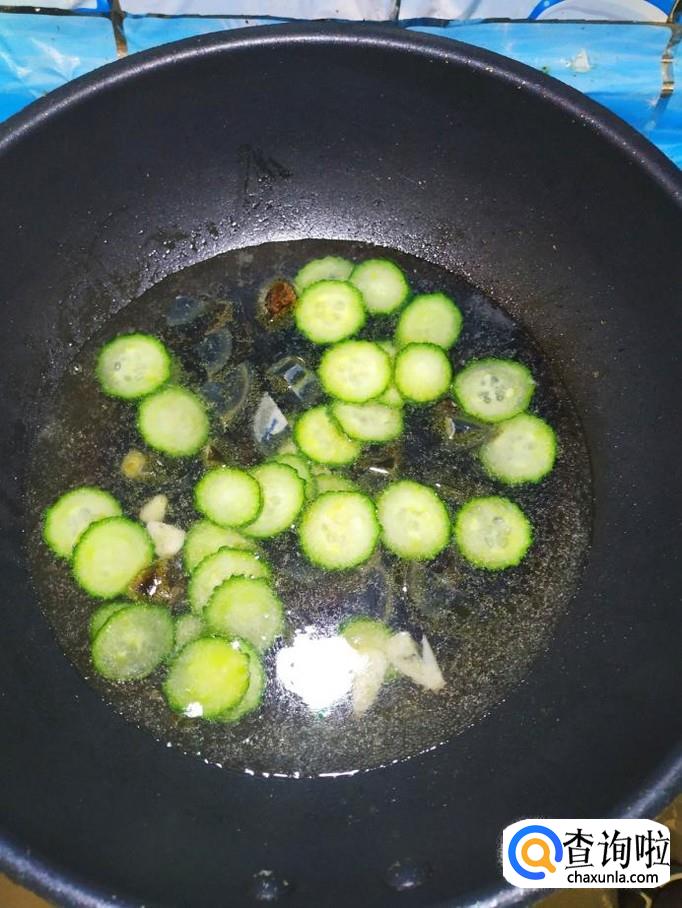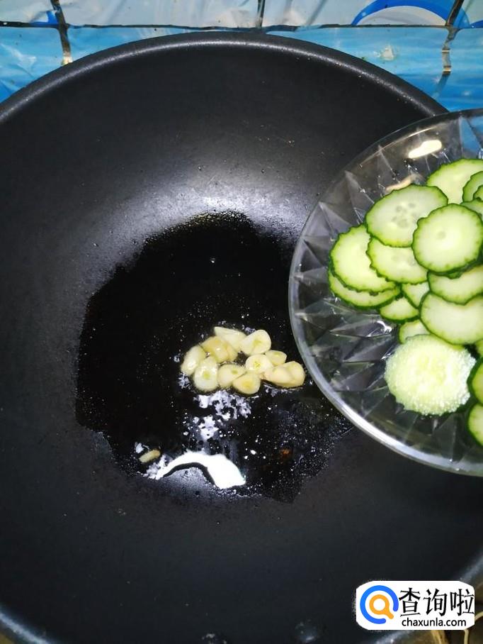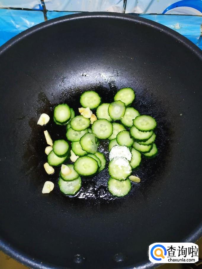 准备适量蒜,剥去外皮,切成片备用。炒锅中放入适量油,油热后,将蒜片儿放入锅中炒香,然后将黄瓜放入锅中翻炒一下。