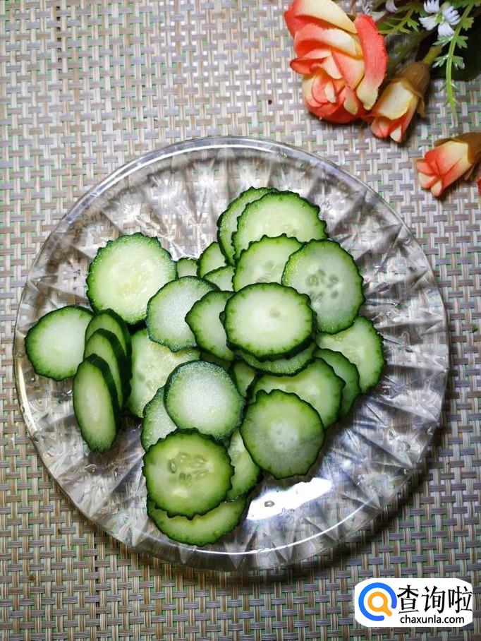 再准备一根黄瓜,洗净后切成片,片儿可以切得稍微厚一些,这样吃起来更有口感。