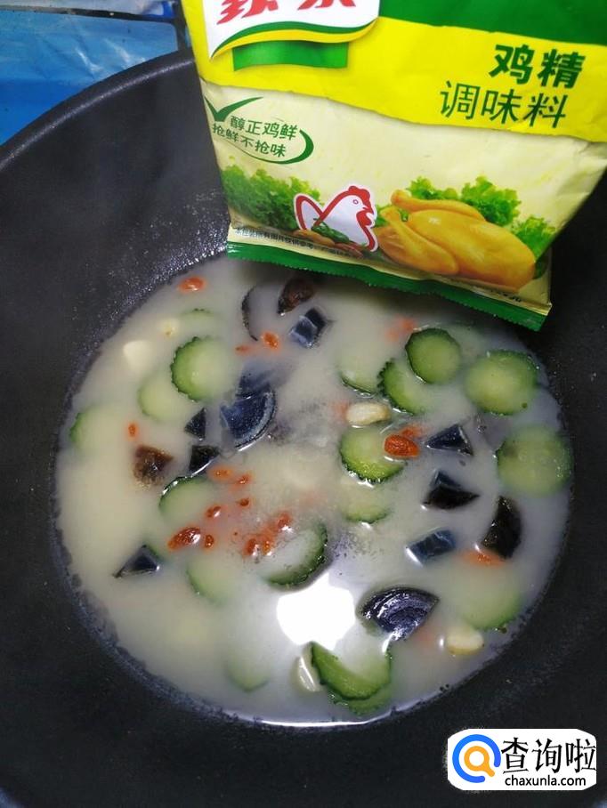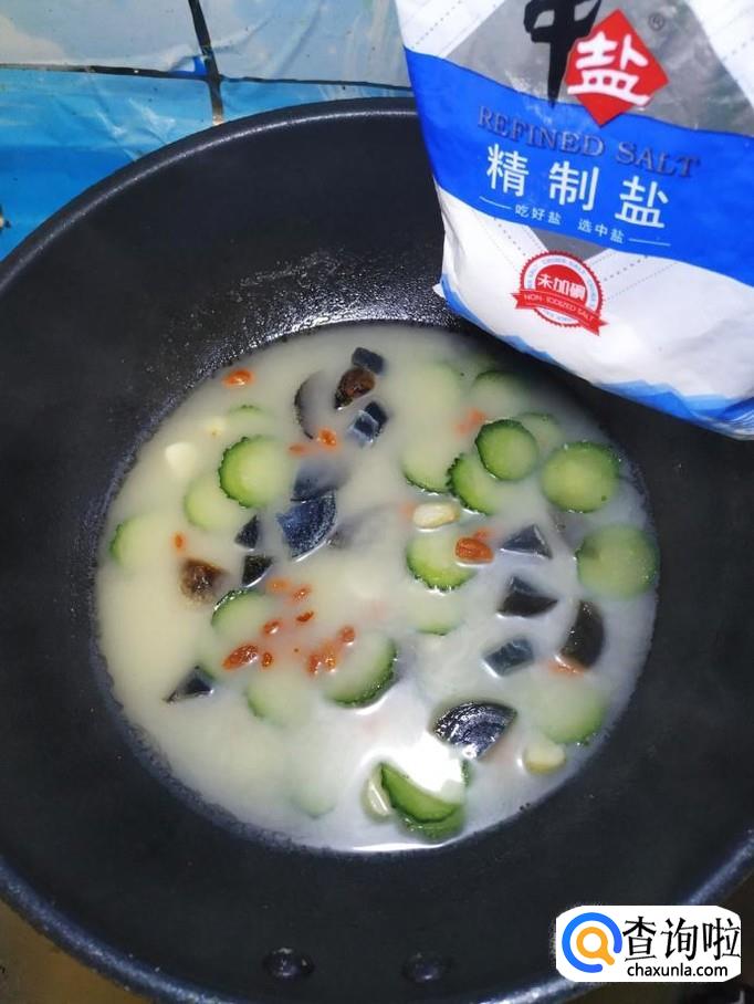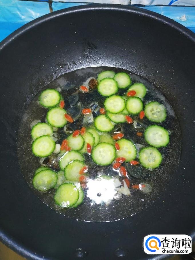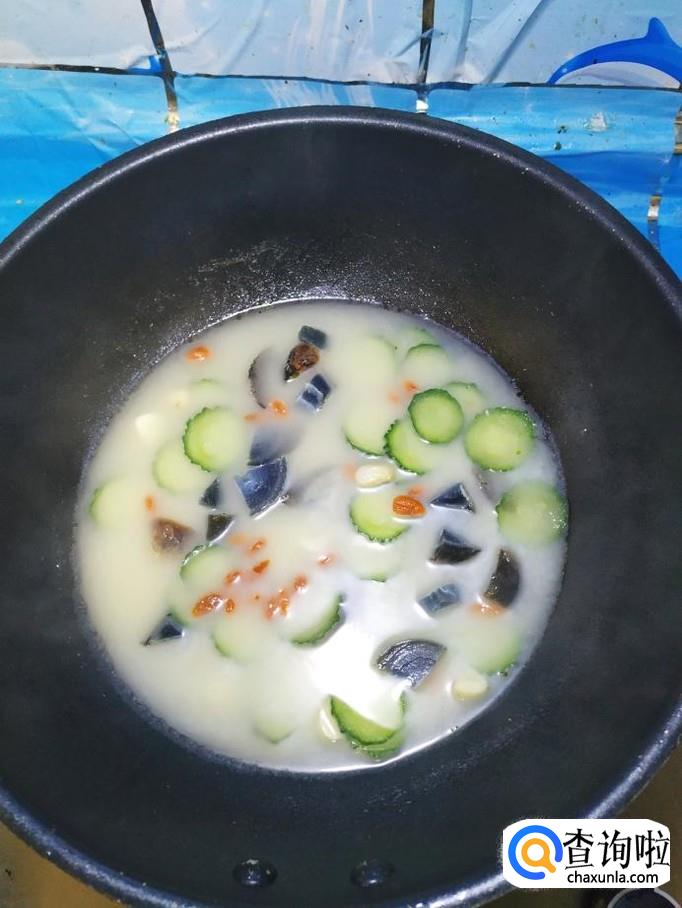 加入一大碗清水,准备适量枸杞子,提前泡好。将泡好的枸杞子倒入锅中,和皮蛋,黄瓜一起煮一下。