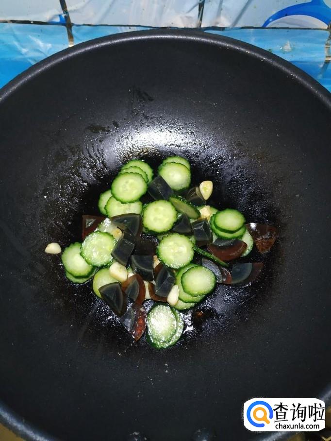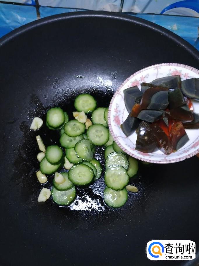 将皮蛋放入锅中,和黄瓜一起翻炒均匀。煮过的皮蛋,蛋黄是硬的,不用担心炒散。