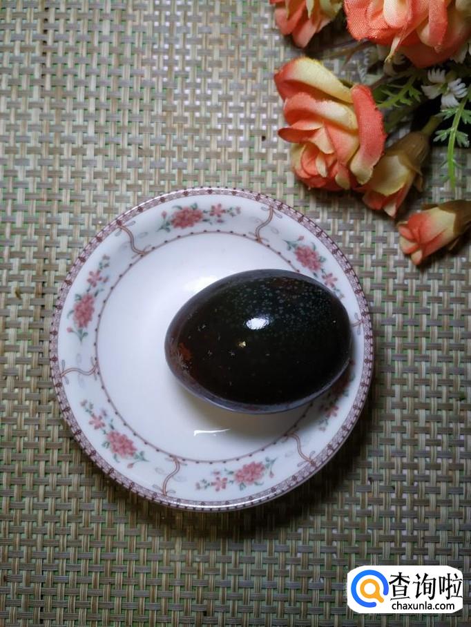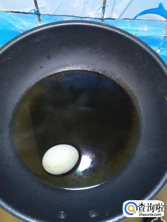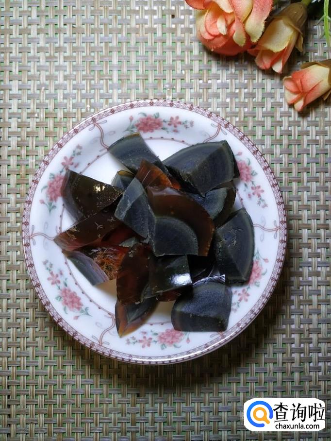 将松花皮蛋放入锅中,再稍微煮一下,煮好之后,取出来,剥去外皮,切成块,放入盘中备用。