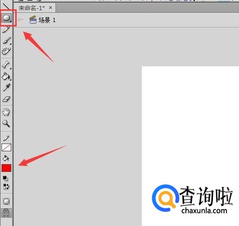 打开flash之后在工具箱内找到椭圆形选项,并设置填充色为红色,描边色为无,如图所示: