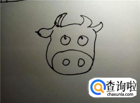 先画奶牛的头部,有四个尖尖的角,嘴巴和鼻子都画出来。