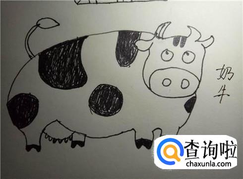 最后画上奶牛身上黑色的色块,涂上纯黑色,色块的形状尽量不要长得一样哦,要多样化,这样逼真的一个奶牛就画好啦。