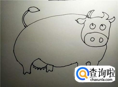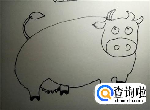 然后再把奶牛肥胖的身躯形状给画出来,四个脚,一条短短的小尾巴,还有奶牛的奶泡也画出来。