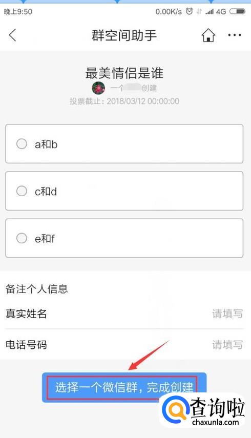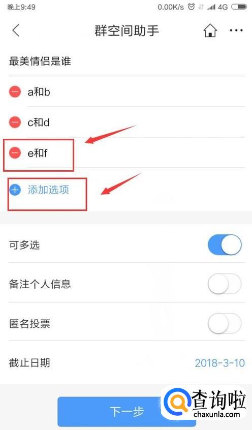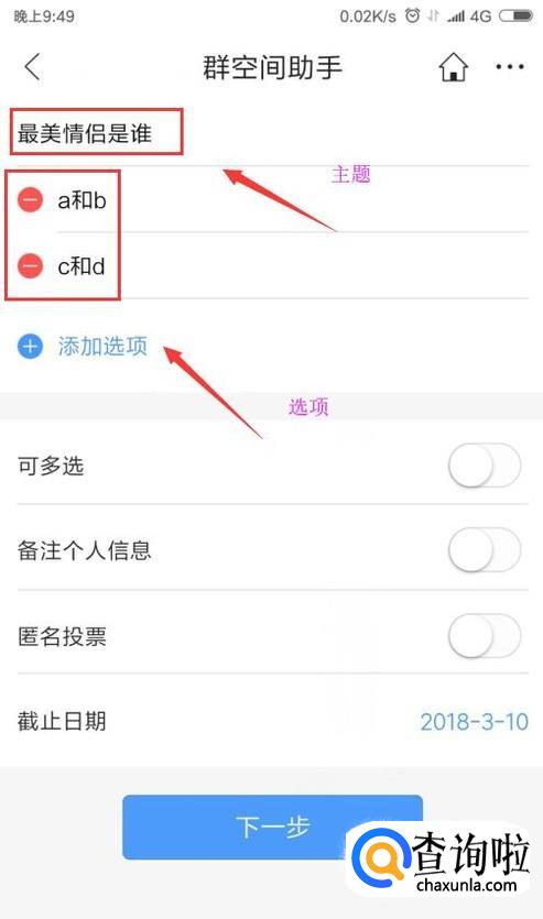 我们接着设置我们的投票主题和投票选项,如图。