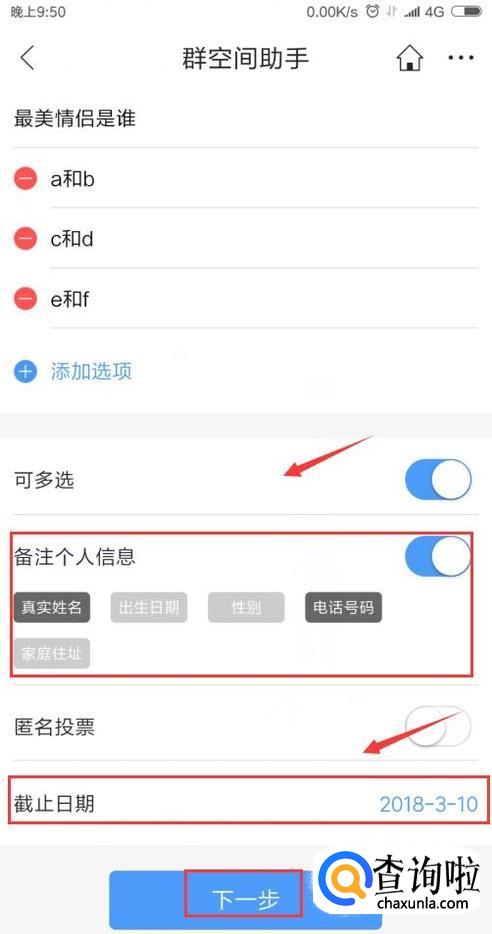 假如不是匿名投票,我们就要留下什么信息,接着我们来设置截止日期,最后点击下一步,如图。