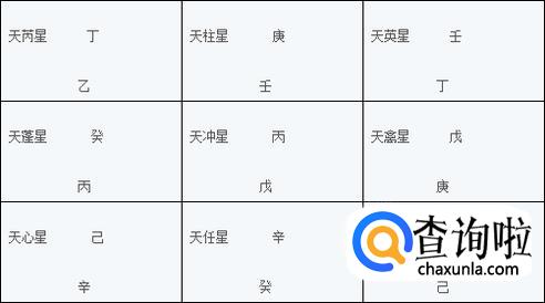 根据九星的排列再在九星现在的落宫内排出九星原来附带的地盘奇、仪,标在地盘奇、仪的上面,这就是天盘干。天蓬星原属坎宫,坎宫现在的地盘干是癸,所以就将癸落在天蓬星所在的震宫,此时震宫内天盘干是癸地盘干是丙。天英星原属的离宫现在地盘是壬,那么就将壬落在天英星现在所在的坤宫,其他以此类推。