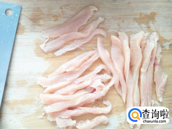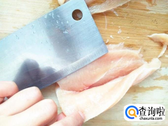 鸡胸肉横切开之后,分别用刀切成长条。