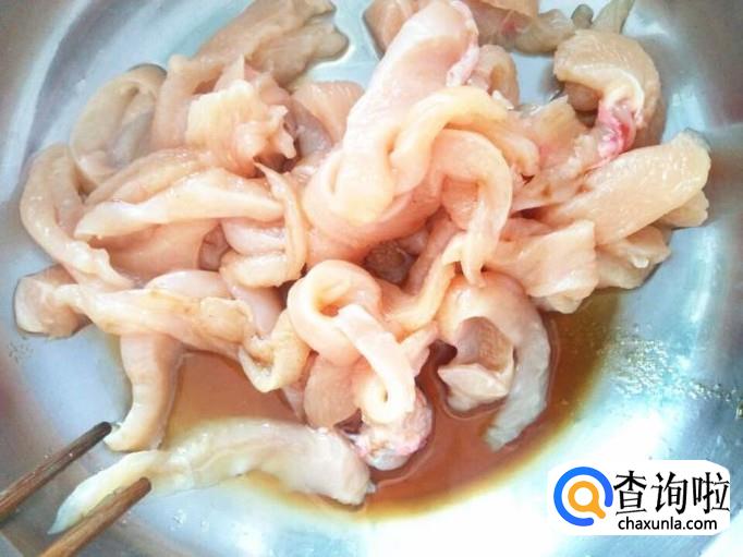 鸡胸脯肉比较厚实,在切长条之前,先用刀将鸡胸肉横着对半剖开,很简单的,看着下面这张图,跟着羊儿做。