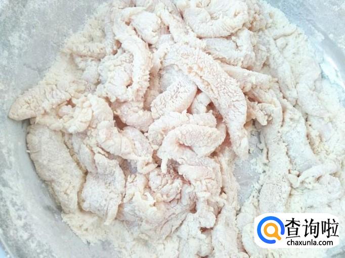 撒上面粉之后,我是直接用手搓的,不然面粉无法均匀的包裹住鸡肉条。着急,用手慢慢的搓,直到鸡肉条不再粘手,一条条很分明的时候就可以了。