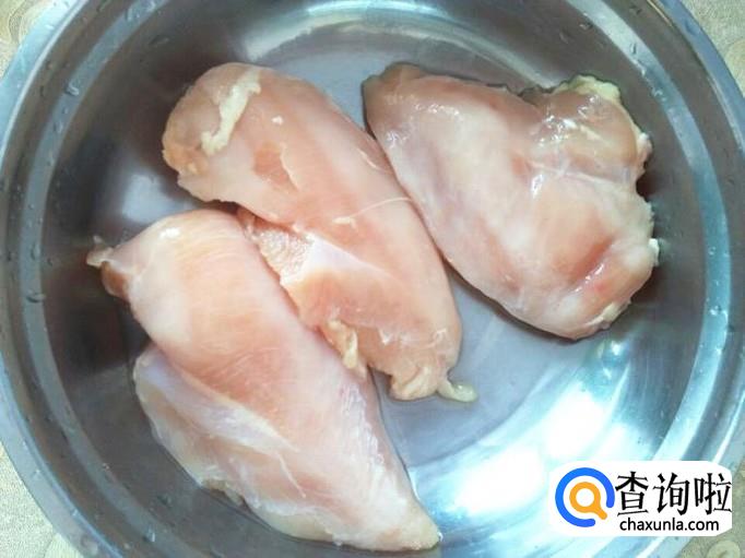三块鸡胸脯肉,其实我只用了一块多一点点,这就炸了满满一盘子。鸡胸肉清洗干净,控干水。