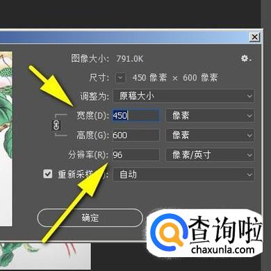 图片当前的尺寸大小是450X600像素;分辨率是96;假设要提高分辨率为200;那么,把96删除,再输入200;点确定。那么,该图片的分辨率即提高了。随之图片尺寸大小也会提高。