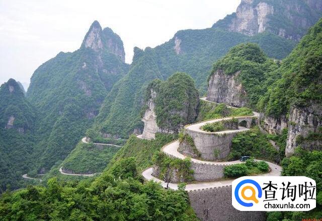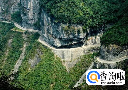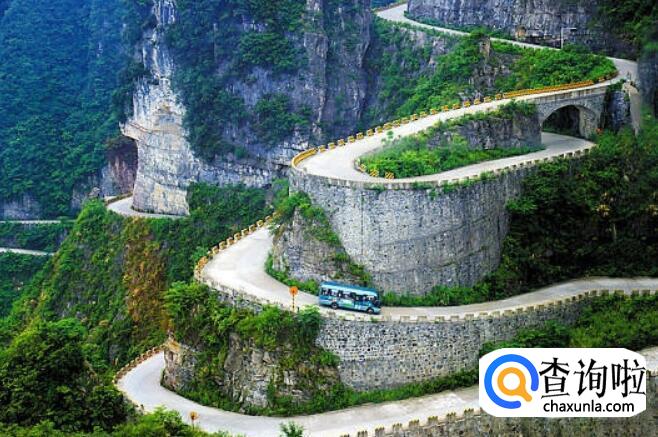 天门山盘山公路是位于张家界天门山的一条公路,距离张家界市区大约8公里左右,有"通天大道"之称,全长10.77公里,海拔从200米急剧提升到1300米,大道两侧绝壁千仞,空谷幽深,共计99个弯,180度急弯此消彼长,似玉带环绕,弯弯紧连,“天下第一公路奇观”横空出世。