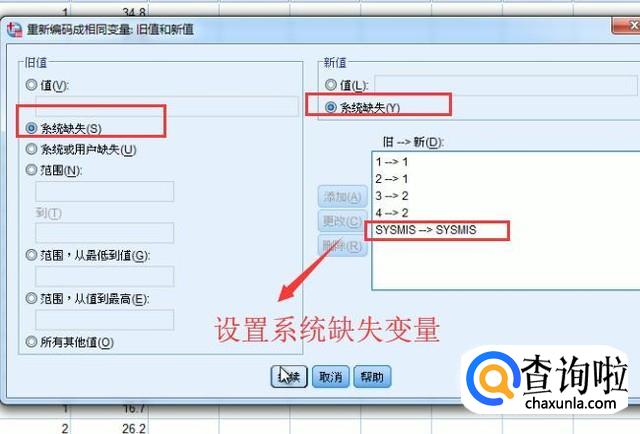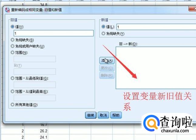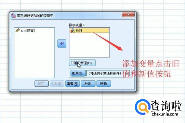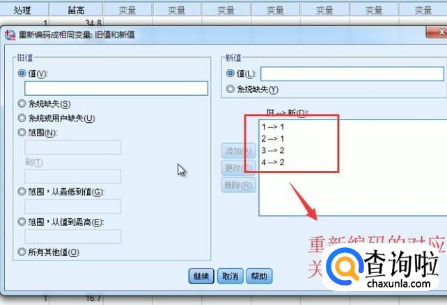 接着会弹出重新编码的界面,我们选择要重新编码的变量,然后点击旧值和新值按钮,如下图所示