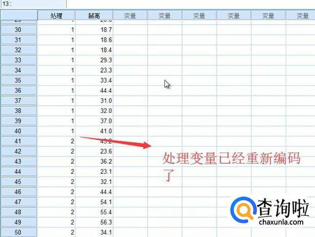 最后我们回到SPSS软件主界面,我们就可以看到所有的第一列变量都重新编码了,如下图所示