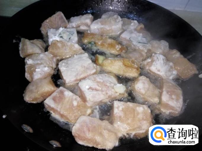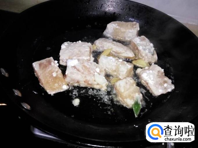 将腌制好的鱼段逐个放在碗里的淀粉里滚一下,让四面都沾上淀粉,然后放在煎锅内开始煎烤。注意:一定要用小火,不能急!
