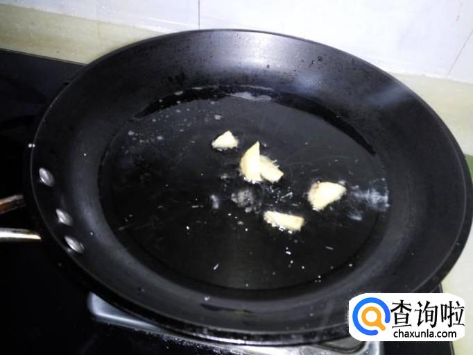 准备一只小碗,倒入小半碗淀粉;然后将平底锅用微火烧热,放入食用油和生姜。说明:一定要水烧干后放油,否则油会四溅,因是煎烤,油尽量多些。
