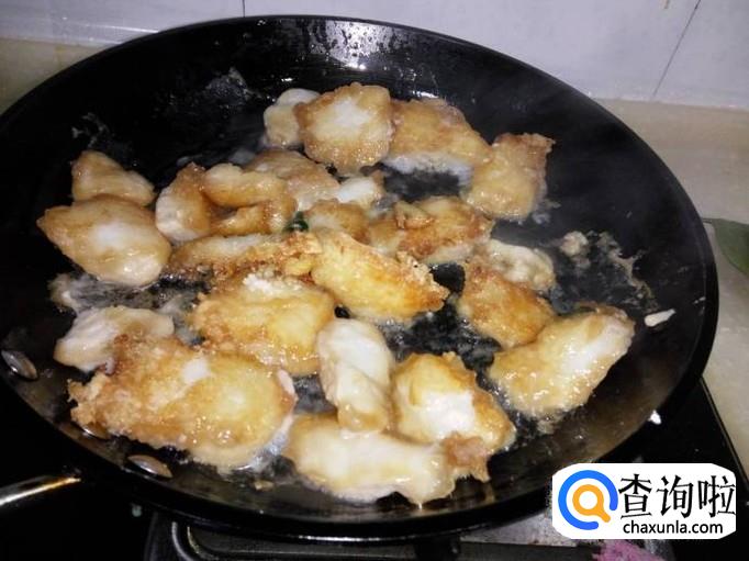 待鱼段一面煎制金黄后,用铲刀轻轻地将鱼段翻个身,继续煎制。